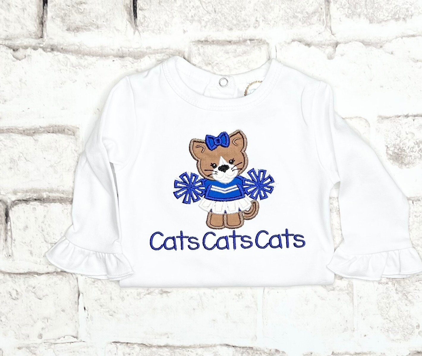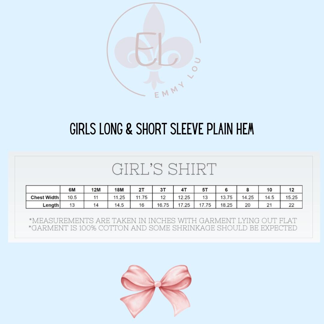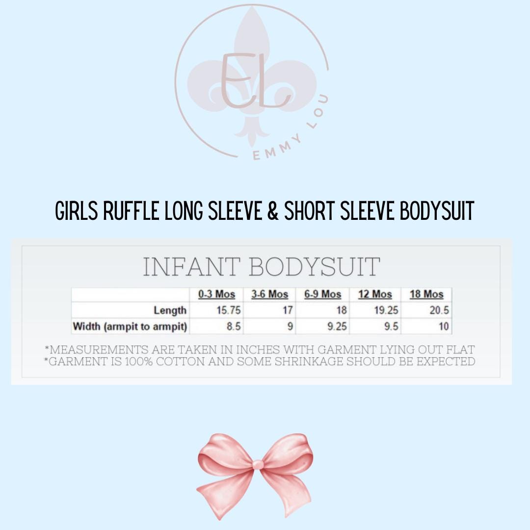 Shown on a shirt with ruffle hem. Plain hem shirts are also available. Please note that the shirt option only starts in 12 month sizing. If you would like a smaller size, the option will be a bodysuit with either short puff sleeves or long ruffle sleeves. Any questions, just message me.