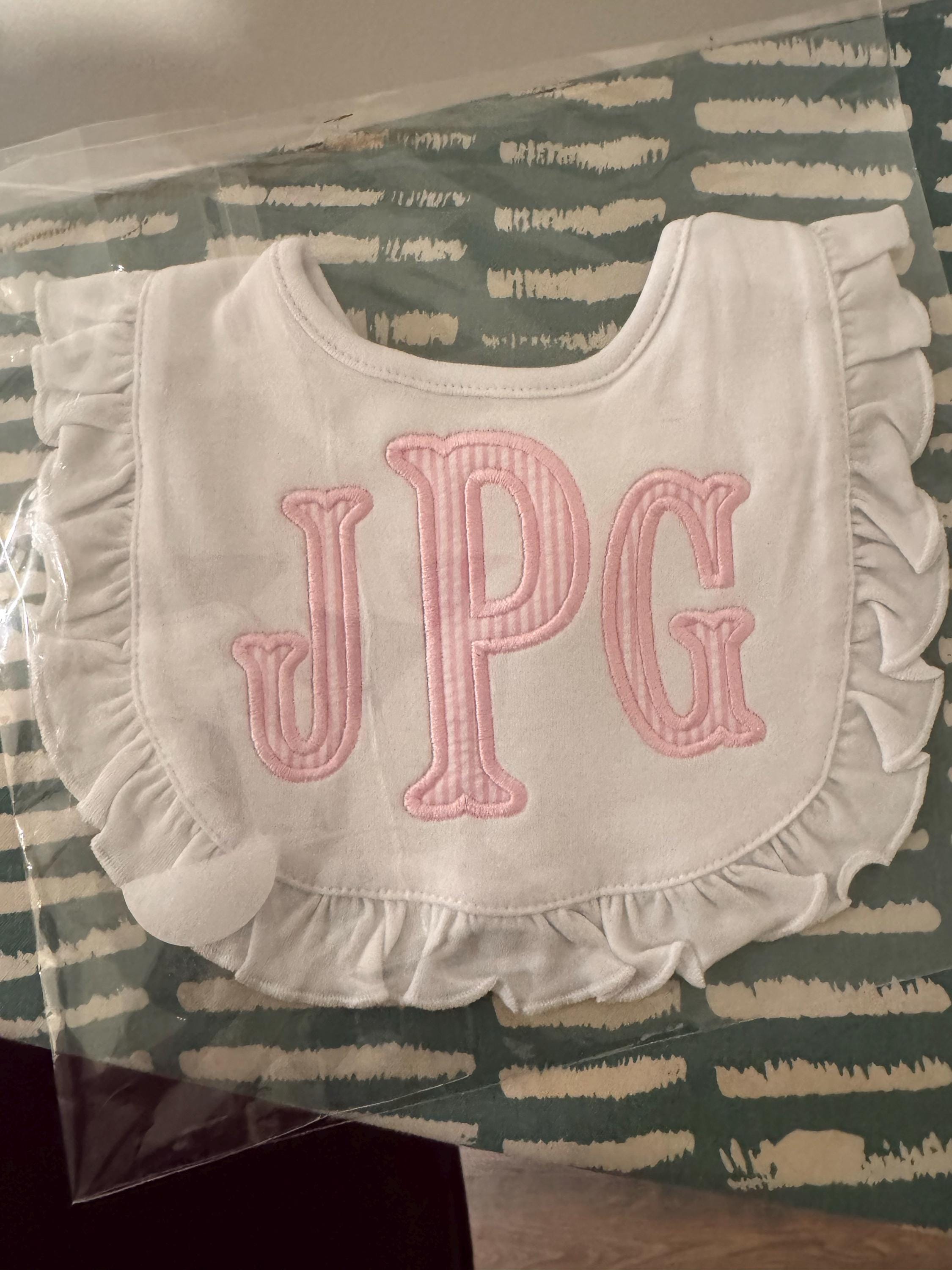 These premium ruffle baby bibs burp cloths feature an interlock knit top layer, chenille terry cloth back layer and a velcro closure.