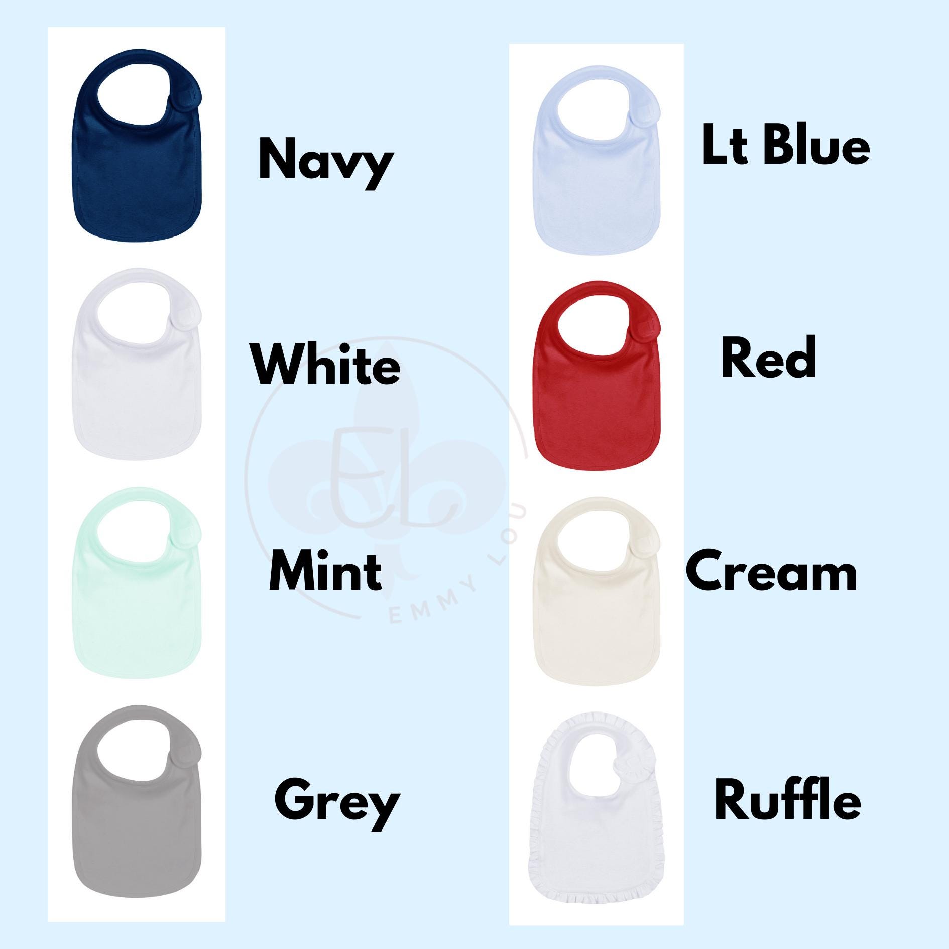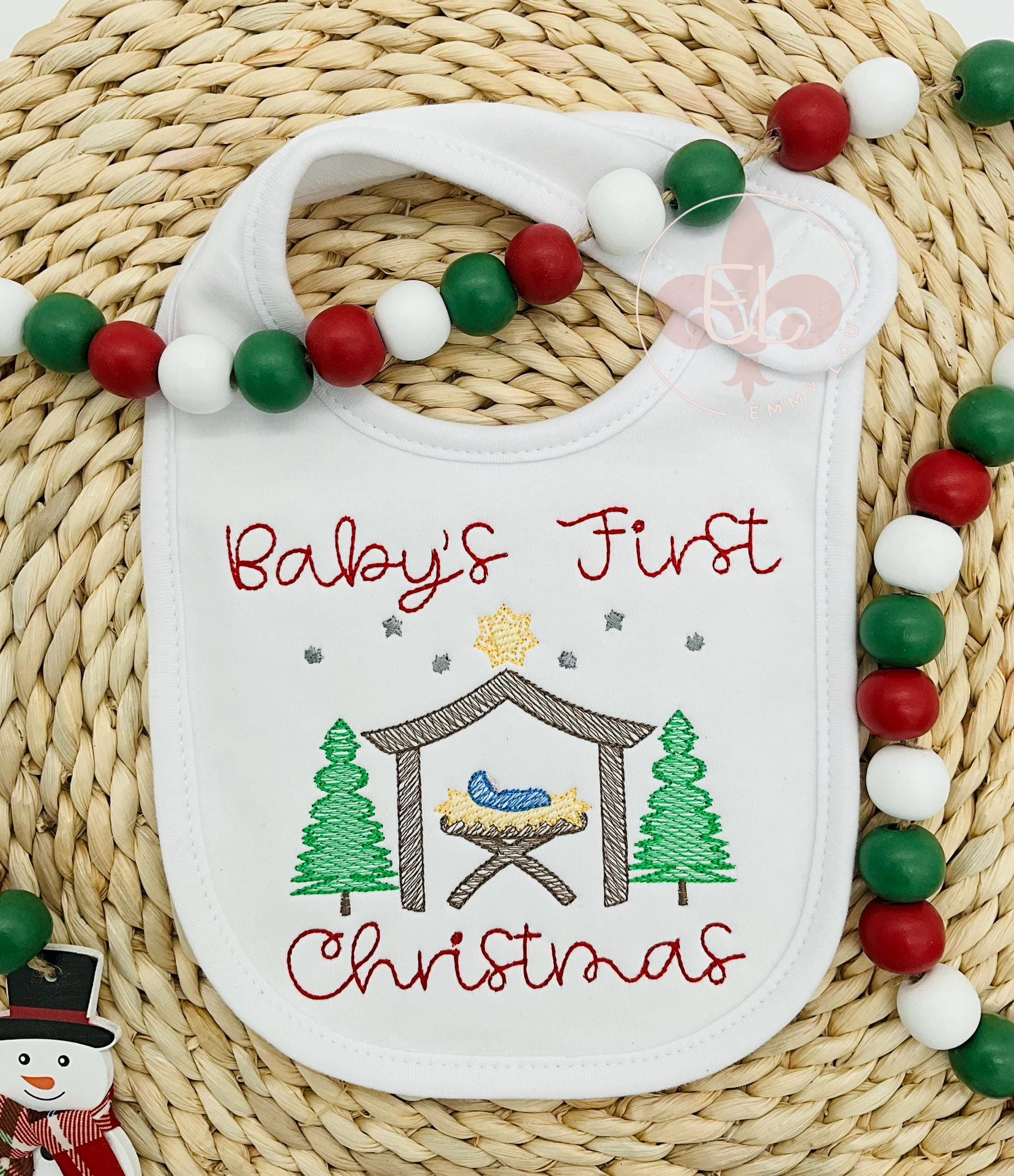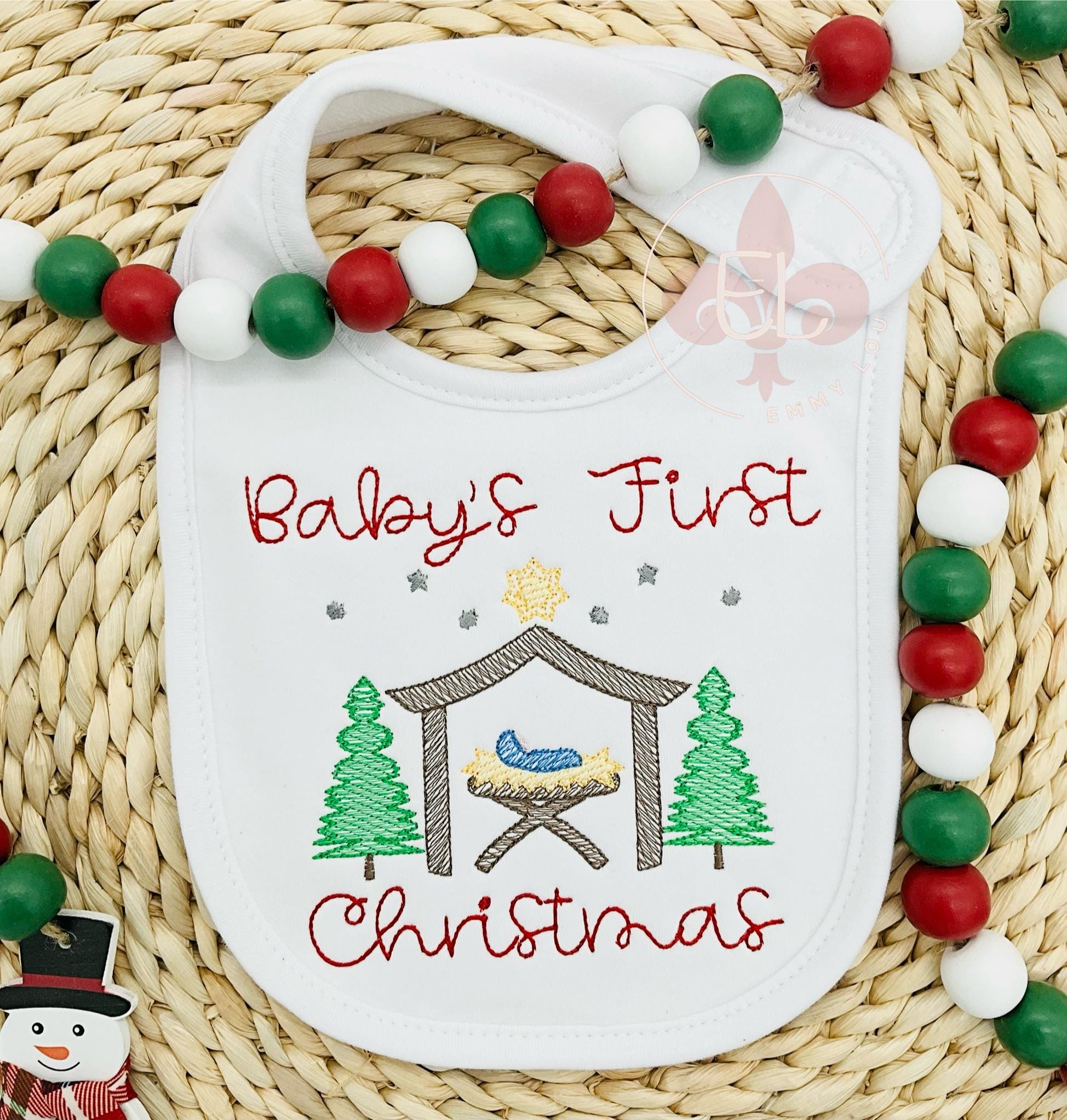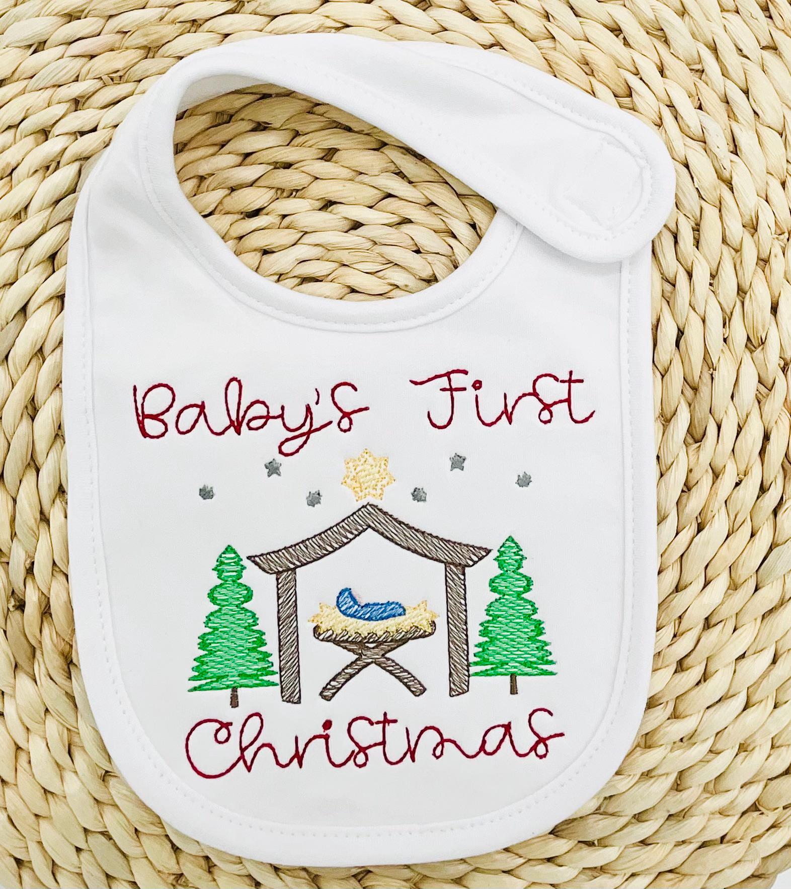 Adorable Applique Bib for Baby's Christimas; Premium Terry Bib with beautiful applique designs and optional personalization. Your choice of adorable Christmas applique designs. Shown here are Present and Ornament.